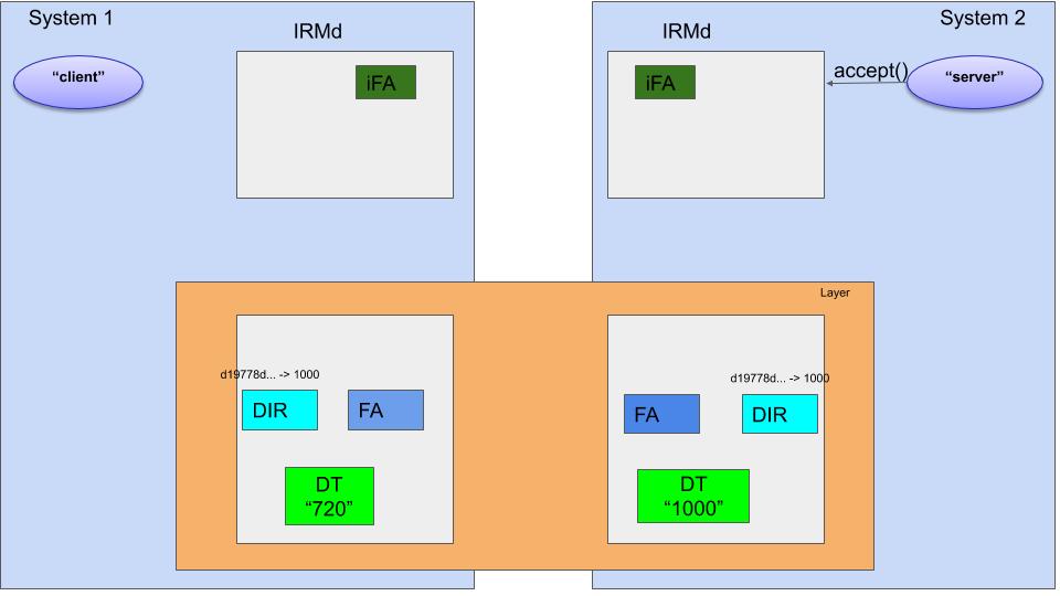 Finally, there is the IRMd in each system. The IRMd should be seen as part of the operating system. One of its tasks is to map process IDs (PIDs) of a process to names. In our example above, the IRMd in System two will have a mapping that maps d19778d2 to the PID of “server”. When the “server” program calls the Ouroboros flow_accept() routine, the IRMd knows that when there is an incoming flow allocation request, the “server” process can handle it. Populating this mapping in the IRMd is a process we call binding a name to a process.