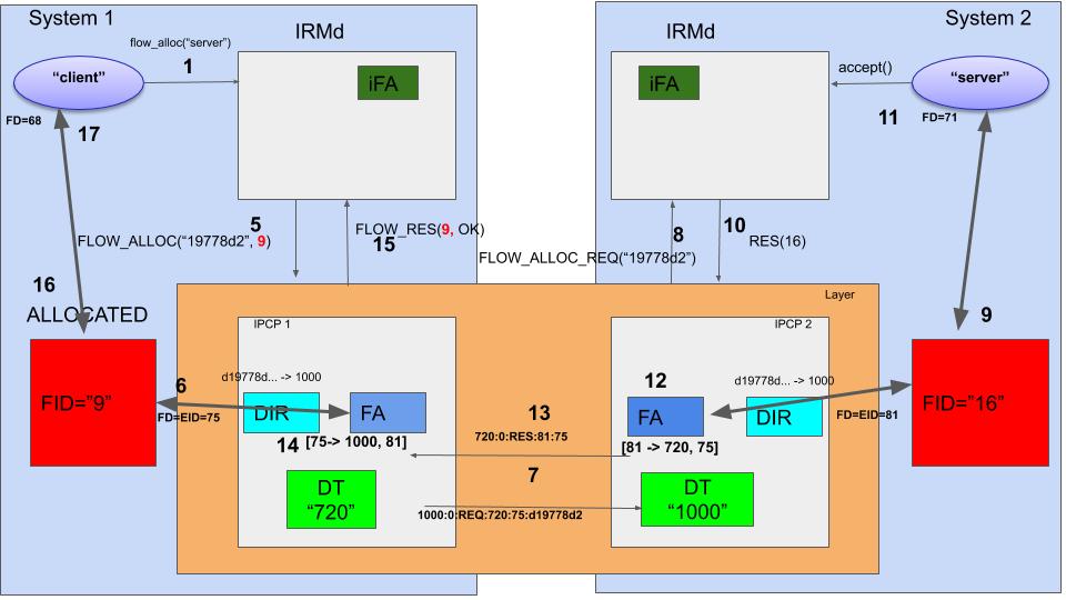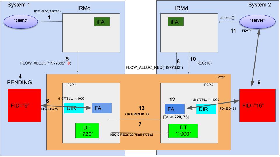 Now it send a FLOW_ALLOC_REQ() message to the IRMd (8). The IRMd has in its process table an entry that says that there is a process that listens to this hash. It will create a flow endpoint, for instance with FID=16 (9) and respond to the IPCPd that the flow is accepted with FID=16 (10). The flow_accept() call on the server side will return with an fd=71 that points to the FID 9. From this point on, the server can use the flow (11).