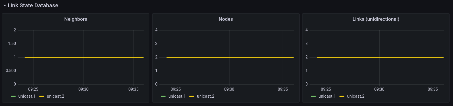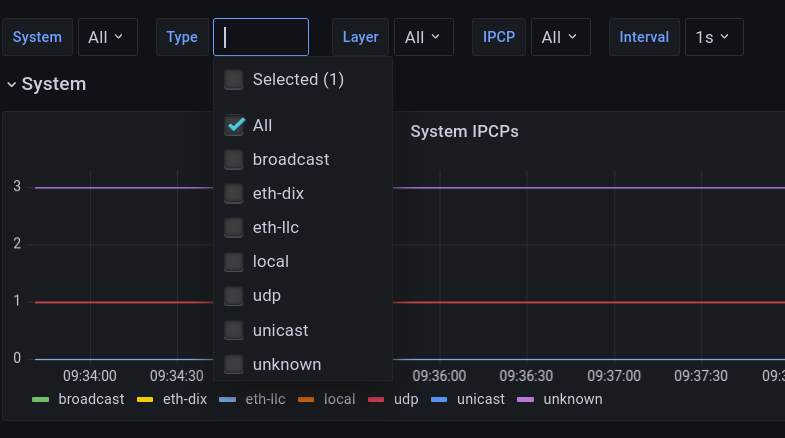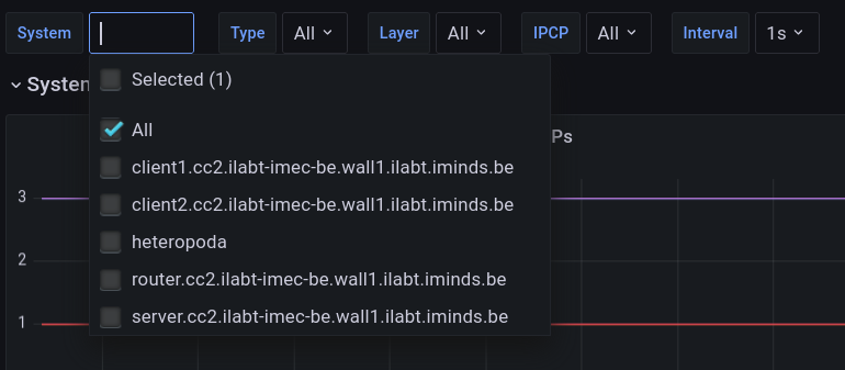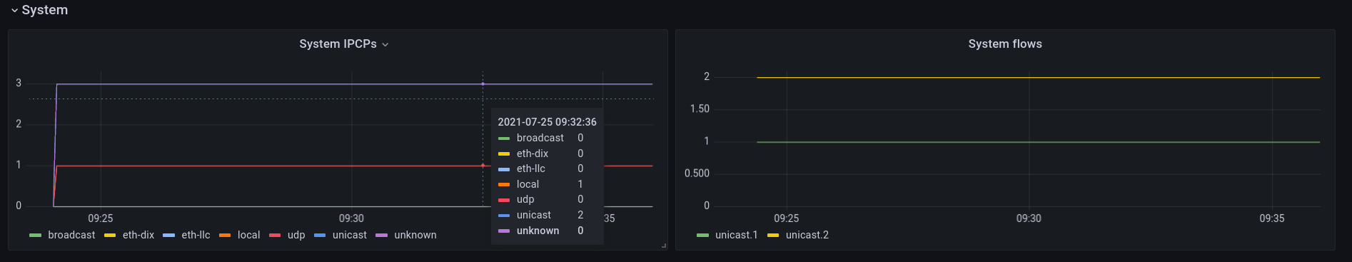 The system panel shows the number of IPCPs and known IPCP flows in all monitored systems as a stacked series. This system is running a small test with 3 IPCPs (2 unicast IPCPs and a local IPCP) with a single flow between oping server/client(which has one endpoint in each IPCP, so it shows 2 because this small test runs on a single host). The colors on the graphs are sometimes not matching the labels, which is a grafana issue that I hope will get fixed soon.