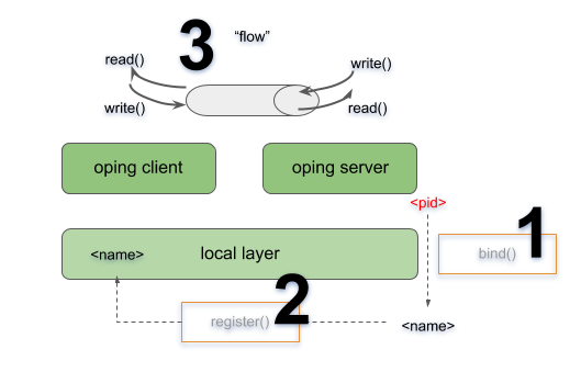 ==02301== irmd(DB): This process accepts flows for:The server application is not yet reachable by clients. Next we will bind the server to a name and register that name in the “local_layer”. The name for the server can be chosen at will, let’s take “oping_server”. In the second terminal window, execute: